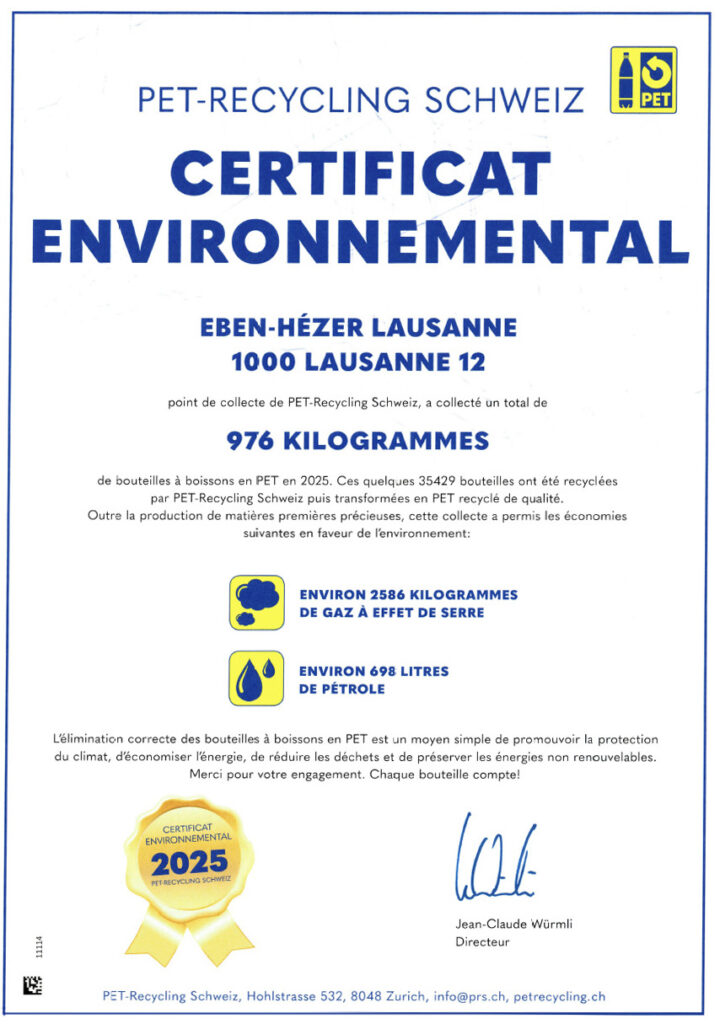 Eben-Hézer Lausanne a collecté 35 429 bouteilles recyclées par PET-Recycling Schweiz en 2025, ce qui représente près d’une tonne de bouteilles en PET. Un résultat qui a permis d’éviter l’émission de 2 586 kg de gaz à effet de serre et d’économiser quelque 698 litres de pétrole. Bravo à toutes et à tous pour ce résultat magnifique !