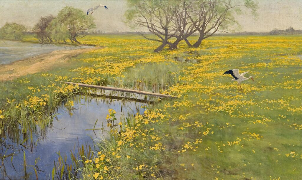 Ce tableau est dominé par un vert printanier lumineux et l’on voit un champ de jonquilles. Les arbres indiquent l’arrivée du printemps. En arrière-plan, un ciel typiquement printanier mêle des nuances de bleu et de gris. Émotionnellement, ce tableau inspire la quiétude, le calme et le repos. Face à lui, on ne peut que lâcher prise. Une subtilité propre aux paysages d’Europe de l’Est s’en dégage. Deux hérons, revenant probablement nidifier, apportent de la vie à la scène et se détachent nettement sur le décor.