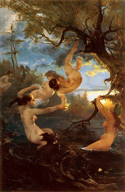 Ce tableau est particulier. On y voit quatre nymphes un soir d’été, probablement au soleil déclinant, avec en arrière-plan un ciel nuageux bleu-gris. Un jeu de lumière subtil crée un contraste marqué entre ombre et clarté. L’élément le plus surprenant est qu’une des nymphes semble suspendue à un arbre. Sur le plan émotionnel, l’ensemble paraît irréel, comme inspiré d’un rêve : les nymphes semblent danser en flottant dans l’air.