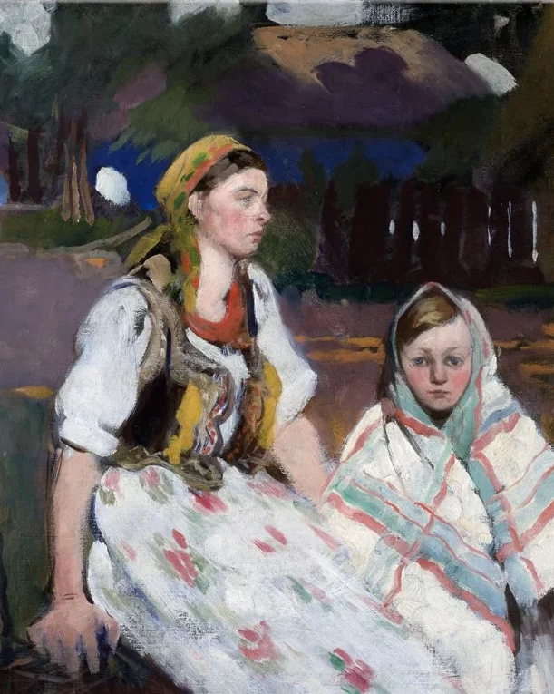 Deux paysannes, vêtues de costumes ruraux polonais, sont assises devant ce qui semble être la ferme familiale. L’une paraît plus âgée — probablement la sœur aînée — tandis que l’autre semble plus jeune. Leurs visages traduisent la fatigue propre à la vie rurale harassante du début du XXᵉ siècle : l’une regarde au loin, l’air absent, tandis que l’autre semble nous fixer. Ces regards témoignent d’une journée éprouvante. Ce qui retient particulièrement l’attention, ce sont les couleurs vives des costumes, qui éclairent ce tableau sombre. Les visages, quant à eux, parlent d’eux-mêmes : on y lit à la fois beauté, tristesse et dureté.
