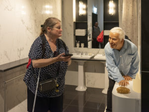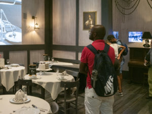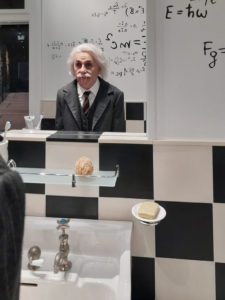 En arrivant à l’entrée, nous avons été accueillis par la copie de Charlie Chaplin en cire et j’ai eu l’impression qu’il me disait avec sa main: « entre, sois la bienvenue Caroline ! ». En commençant mon exploration, j’ai pu visiter l’intérieur de ses appartements dont la grande et magnifique salle à manger. J’arrive au premier étage et là je rencontre un de ses amis : le physicien Albert Einstein devant le miroir de la salle de bain avec sa fameuse formule : « E = mc2 » inscrite sur le mur.
